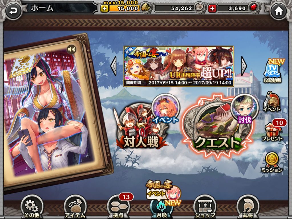 パズルオブエンパイア メモ 歴史上の人物が登場するゲームなのでUIが本モチーフになっていてよいローディング画面の左右の三角ボタンを押したときに本が捲れる音やアニメーションがあったらもっと良さそうホーム画面のレイアウトについて、対人戦ボタンが真ん中にありすぎて押しづらいので、クエスト共に右下とかに持ってきたほう押しやすくなりそう。「その他」ボタンが左下にあるのが珍しい… ストラテジー, ファンタジー, 歴史